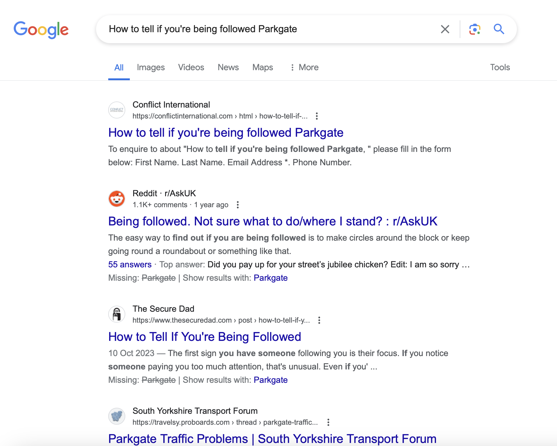 Check out these top positions in Google for “How to tell if you’re being followed Parkgate